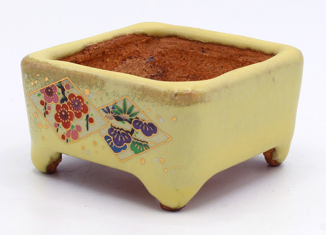 Una maceta muy especial creada por Hattori en conmemoración del décimo aniversario del vivero de bonsáis y museo Shunka-en del maestro Kunio Kobayashi. Es una maceta cuadrada que presenta un esmalte predominantemente en tonos lilas pero con un moteado verde-azulado que también puede verse en el borde de la maceta. Se ve su antigüedad por la magnífica pátina qu ha adquirido con los años de estar en uso.